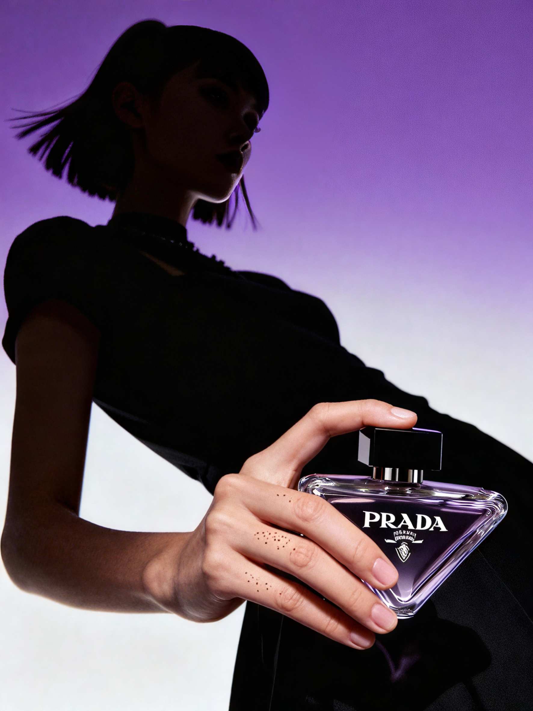 时尚剪影摄影风格,时尚大片,一个女生模特, 穿着时尚黑色服装手拿Prada香水,清晰的毛孔,肌肤真实细节,产品剪影,紫色白色渐变背景,特写镜头,平视视角,高清分辨率,高细节。
