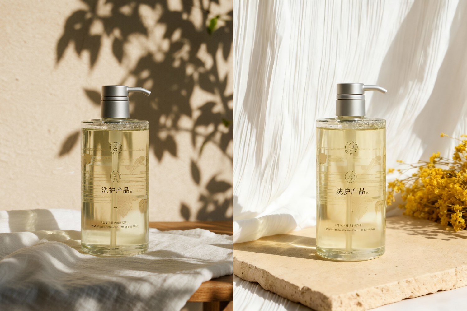 保持参考图产品一致性,产品文字不变,产品细节不变,保留产品主体,产品特写拍摄。将产品置于米色石板上。背景为白色垂坠布料和黄色干花。阳光照射在瓶身与石板上,营造出自然宁静的氛围。