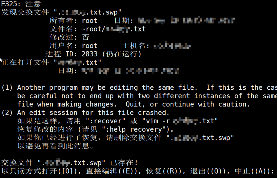 方法1:单开一个窗口找到路径删除交换文件,删除vim临时文件 rm -f .文件名.swp