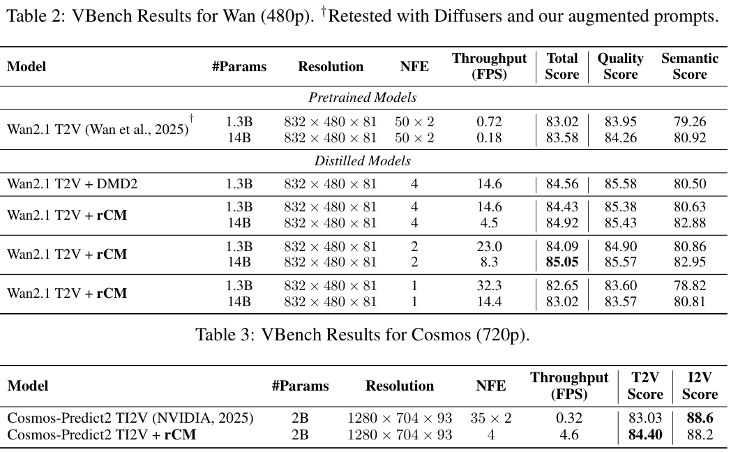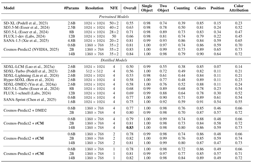 研究团队在多个大规模模型上验证了rCM的性能,包括Cosmos-Predict2 T2I模型(6亿、20亿、140亿参数)和Wan2.1 T2V模型(13亿、140亿参数)。