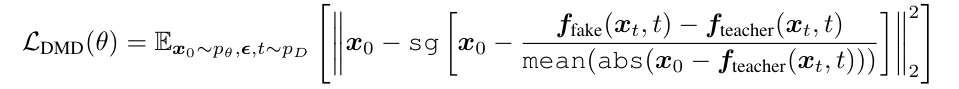 在多种分数蒸馏方法中,团队最终选择了内存效率更高的分布匹配蒸馏(Distribution Matching Distillation, DMD),其损失函数如下: