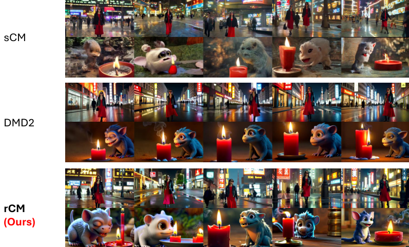 这意味着,rCM让高质量的T2I生成进入1步时代,T2V生成进入2步时代成为可能。
