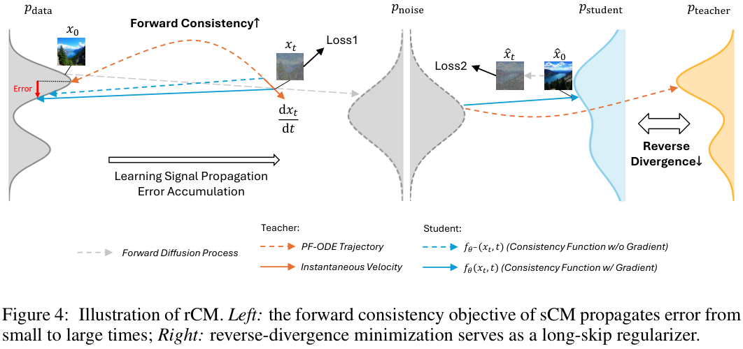 rCM范式成功将连续时间一致性蒸馏从理论推广到百亿参数级别的真实应用,其核心在于开创性地将保证多样性的前向散度(sCM)与保证质量的反向散度(DMD)相结合,并通过强大的工程实现能力,解决了大规模训练中的一系列难题。