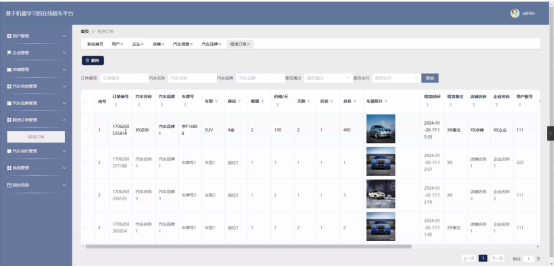租赁订单(订单号、车辆明细、价格/天、天数、折扣、总价、取还时间、租赁备注、支付状态、审核状态)