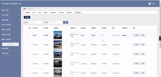 汽车询价功能在视图层(view层)进行交互,比如点击“查询或删除”按钮或填写汽车询价信息表单。这些汽车询价表单动作被视图层捕获并作为请求发送给相应的控制器层(controller层)。控制器接收到这些请求后,调用服务层(service层)以执行相关的业务逻辑,例如验证输入数据的有效性和与数据库的交互。服务层处理完这些逻辑后,进一步与数据访问对象层(DAO层)交互,后者负责具体的数据操作如查看或删除汽车询价信息,并将操作结果返回给控制器。最终,控制器根据这些结果更新视图层,以便汽车询价功能可以看到最新的信息或相应的操作反馈。汽车询价界面如图5-12所示: