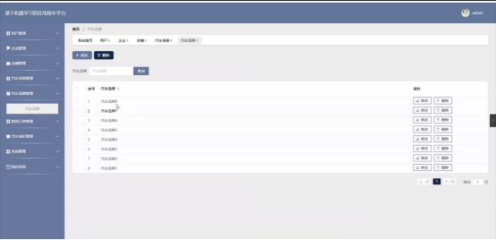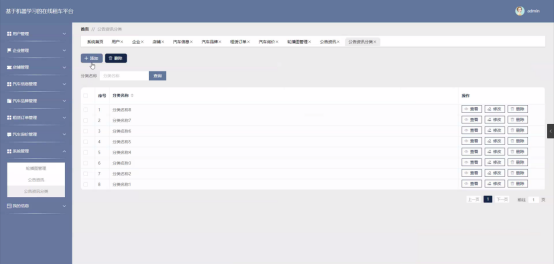 汽车信息功能在视图层(view层)进行交互,比如点击“查询或删除”按钮或填写汽车信息表单。这些汽车信息表单动作被视图层捕获并作为请求发送给相应的控制器层(controller层)。控制器接收到这些请求后,调用服务层(service层)以执行相关的业务逻辑,例如验证输入数据的有效性和与数据库的交互。服务层处理完这些逻辑后,进一步与数据访问对象层(DAO层)交互,后者负责具体的数据操作如修改或删除汽车信息,并将操作结果返回给控制器。最终,控制器根据这些结果更新视图层,以便汽车信息功能可以看到最新的信息或相应的操作反馈。汽车信息界面如图5-10所示: