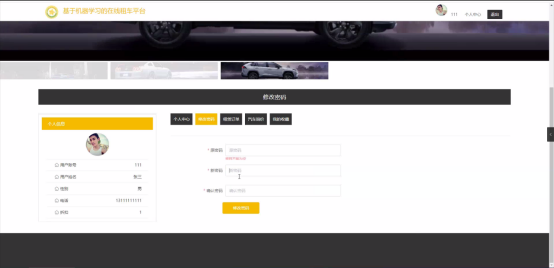 个人中心:在个人中心页面可以对个人中心、修改密码、租赁订单、汽车询价、我的收藏进行详细操作;如图5-4所示: