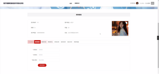 个人中心:在个人中心页面可以对个人中心、修改密码、健康档案、健康建议、体检信息、 医保信息、就诊历史、我的收藏进行详细操作;如图5-3所示: