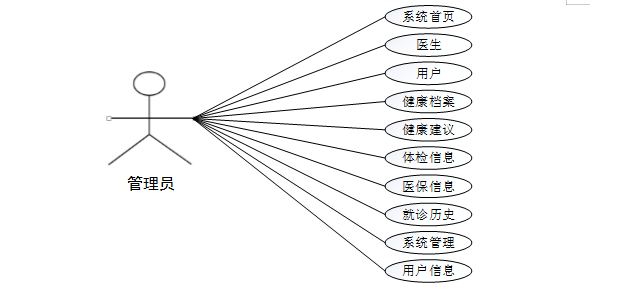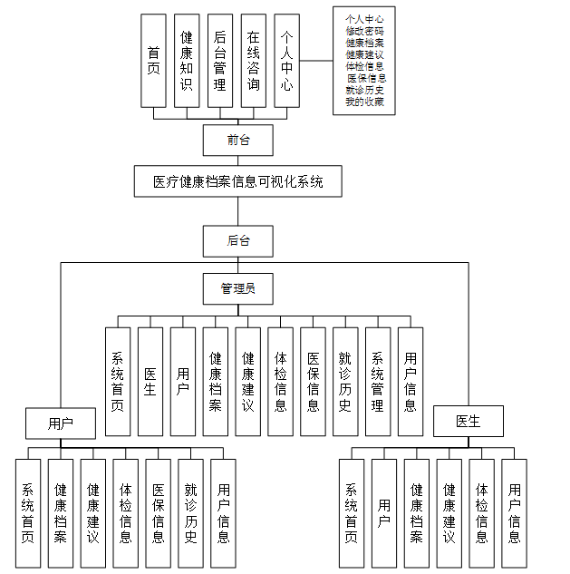 系统整体模块设计:系统分为管理员、医生和用户三大角色,系统管理员有最大的权限,总体功能展示如图4-3所示。