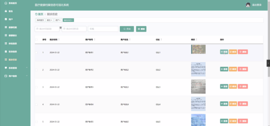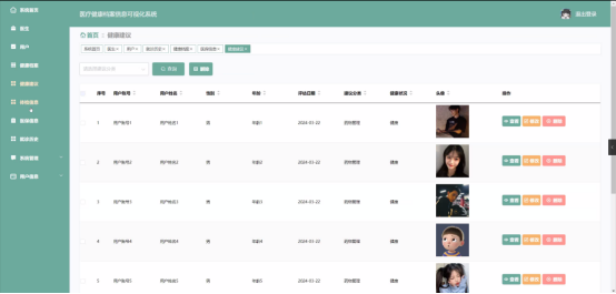 管理员点击健康档案。在健康档案页面输入用户账号和选择风险评估进行查询或删除健康档案列表,并根据需要对健康档案详情信息进行查看、修改、提供建议或删除操作;如图5-8所示: