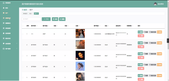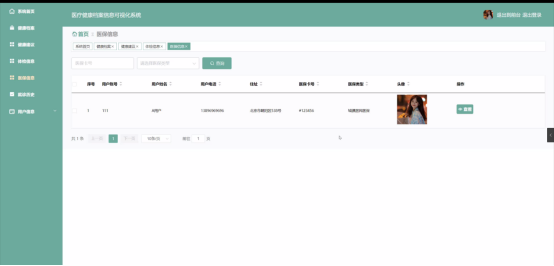 本系统通过分模块设计,主要实现医生、用户、健康档案、健康建议、体检信息、医保信息、就诊历史、系统管理、用户信息等的一体化管理。此外,该系统属于B/S结构,简单易上手,只需体验几次,用户就可以很熟练地使用各种功能。