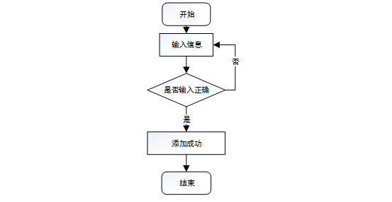 然后是添加信息的页面。进入该页面后,页面会出现一个提示框,示意操作者可以进行信息的添加,从而进行下一步的操作。用户输入想要添加的信息后提交,系统会对输入的内容进行检测。如果检测后输入的信息正确,则会出现“添加成功”的提示框,从而可以进行下一步操作;如果系统检测后检测到想要添加的信息不符合规范要求,则会提示报错,需要进行修改后重新添加。添加信息流程图如图3-5所示:
