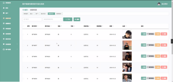 健康档案(用户关联、风险评估、风险等级、健康报告、日期、头像)