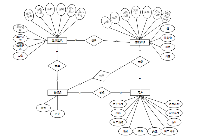 通过对医疗健康档案信息可视化系统的主要功能信息进行规划并分为若干功能实体信息,实体信息将使用E-R图加以表示,在系统中将对 “管理员、用户、健康建议、健康知识”等几个主要的实体属性进行布局,如图4-2所示: