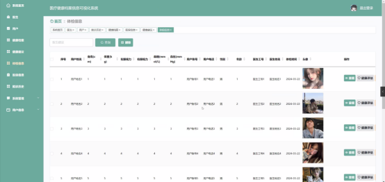 管理员点击体检信息。在体检信息页面输入医生建议进行查询或删除体检信息列表,并根据需要对体检详情信息进行查看、修改、健康评估或删除操作;如图5-10所示: