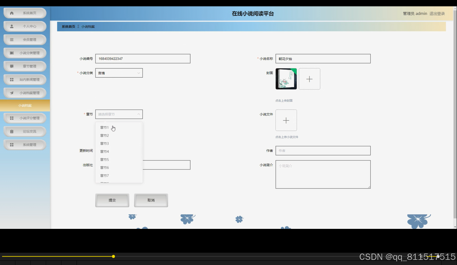 本平台采用SpringBoot作为后端框架,Vue.js作为前端框架,结合MySQL数据库构建一个高效、稳定的在线小说阅读管理系统。后端利用SpringBoot的快速开发特性,实现了用户认证、小说管理、评论互动等核心功能模块;前端通过Vue.js的响应式设计,提供了良好的用户交互体验。平台支持小说分类检索、热门推荐、书签记录等功能,同时管理员可以通过后台管理系统对小说内容、用户信息进行实时管理。数据库设计采用规范化原则,确保数据的一致性和完整性。关键词:SpringBoot、Vue.js、MySQL、小说管理、用户认证。