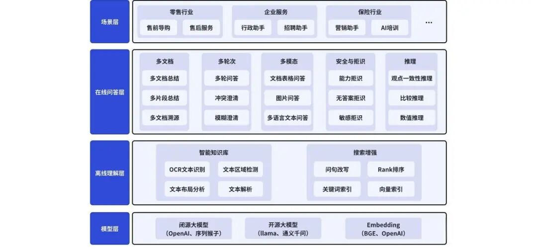 - 在线问答层,为了满足产品设计和交互体验需要,这里支持多文档、多轮次、多模态等。