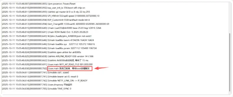 2)观察串口日志,等待“系统已就绪,等待boot按键触发”的提示: