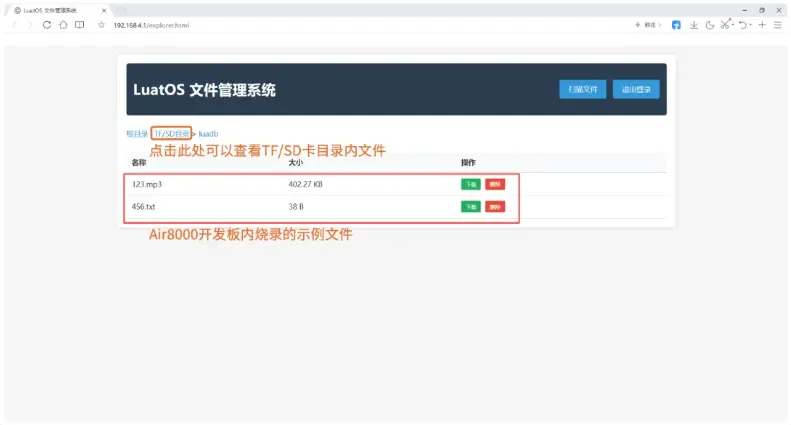 以Air8000开发板为例,通过简单的配置和操作,可以快速将设备变为一个轻量级的文件服务器,用户只需连接到设备创建的Wi-Fi热点,即可通过浏览器方便地浏览、管理和下载设备内部存储及SD卡中的文件。