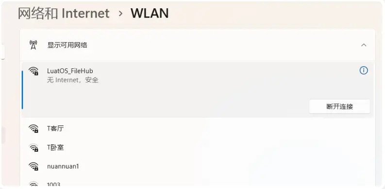 使用手机或电脑搜索并连接名为LuatOS_FileHub的Wi-Fi热点,密码为12345678。