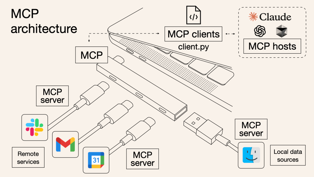 以后AI模型要连数据库、连搜索引擎、连第三方应用,不用每家各订各的协议,只要都支持MCP就能对上话。