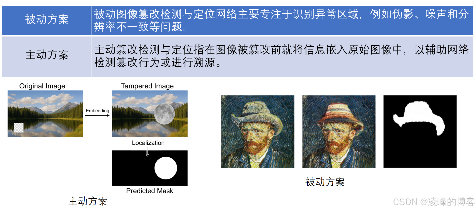 被动方法:不依赖任何水印,通过分析图像内容的不一致性(纹理断裂、噪声分布等)来判断是否被改动。