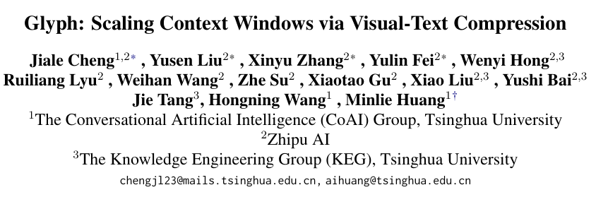 清华大学交叉信息研究院CoAI团队,智谱AI,清华大学知识工程研究室(KEG),提出了一个名为Glyph的全新框架。