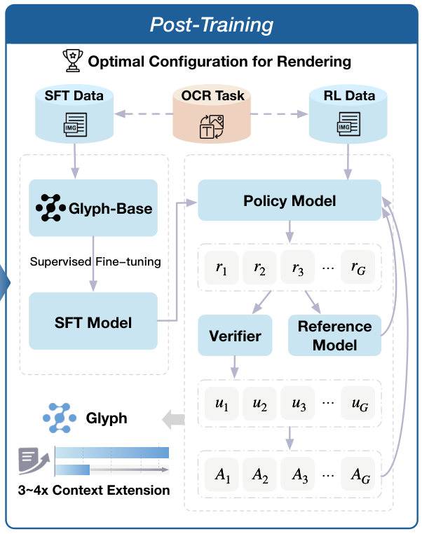 值得一提的是,在整个后训练过程中,Glyph还加入了一个辅助的OCR(光学字符识别)任务。