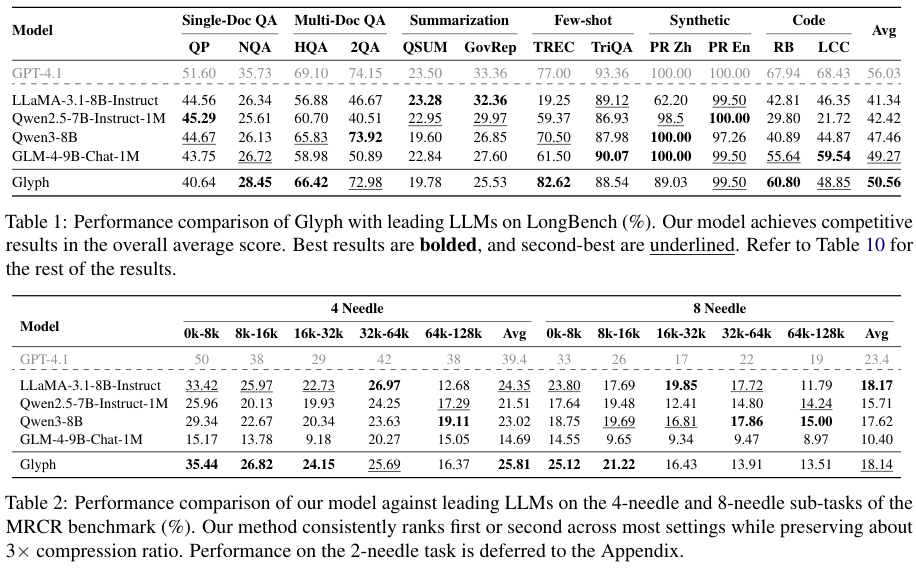 Glyph在一系列长上下文基准测试中,证明了其方法的有效性。