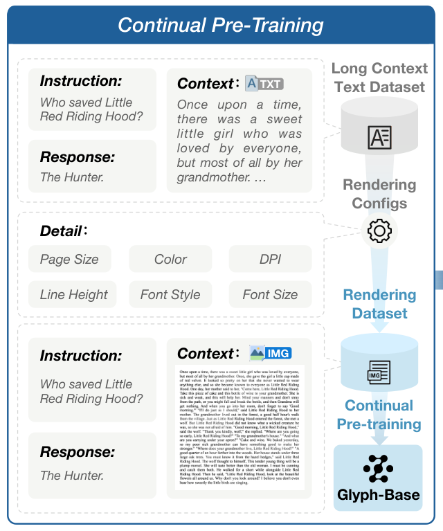 Glyph不再执着于扩展基于Token的文本序列,而是先将长篇文字渲染成一张紧凑的图片,然后让一个视觉-语言模型(VLM)去阅读这张图片。