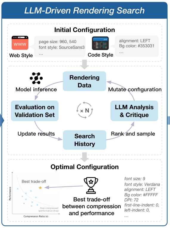 然后,它会用每一种方案去渲染文本,并让一个作为裁判的LLM来评估效果,给出适应度评分。这个评分会综合考虑压缩率,光学字符识别(OCR)的准确率,以及模型在下游任务上的初步表现。