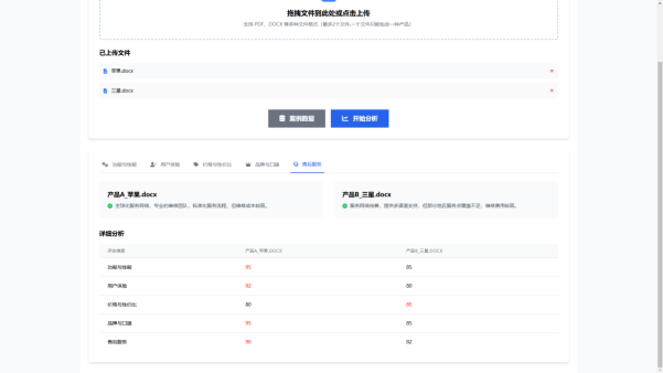 分析完成后,系统以清晰直观的方式呈现结果。在比对结果展示界面,用户可一目了然看到两个产品在各维度的具体表现:以苹果.docx 和三星.docx 的分析案例为例,产品 A(苹果)在功能与性能(95 分)、用户体验(92 分)、品牌与口碑(95 分)、售后服务(90 分)维度表现突出,仅在价格与性价比(80 分)上略逊于产品 B(三星,85 分);产品 B(三星)虽在价格与性价比维度占优,但在功能与性能(85 分)、用户体验(80 分)、品牌与口碑(85 分)、售后服务(82 分)上均落后于产品 A。同时,系统还会针对每个维度详细阐述两产品的优缺点,如产品 B(三星)“服务网络完善,提供多渠道支持,但部分地区服务点覆盖不足,维修费用较高”,让用户不仅知晓分数差距,更能深入了解差距背后的原因,为决策提供更全面的参考。