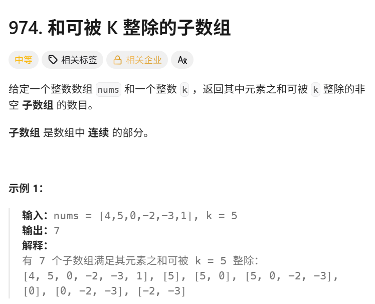 题目分析: 给定一个整数数组 nums 和一个整数 k,统计并返回 nums 的连续子数组中,元素和能被 k 整除的子数组的数目。