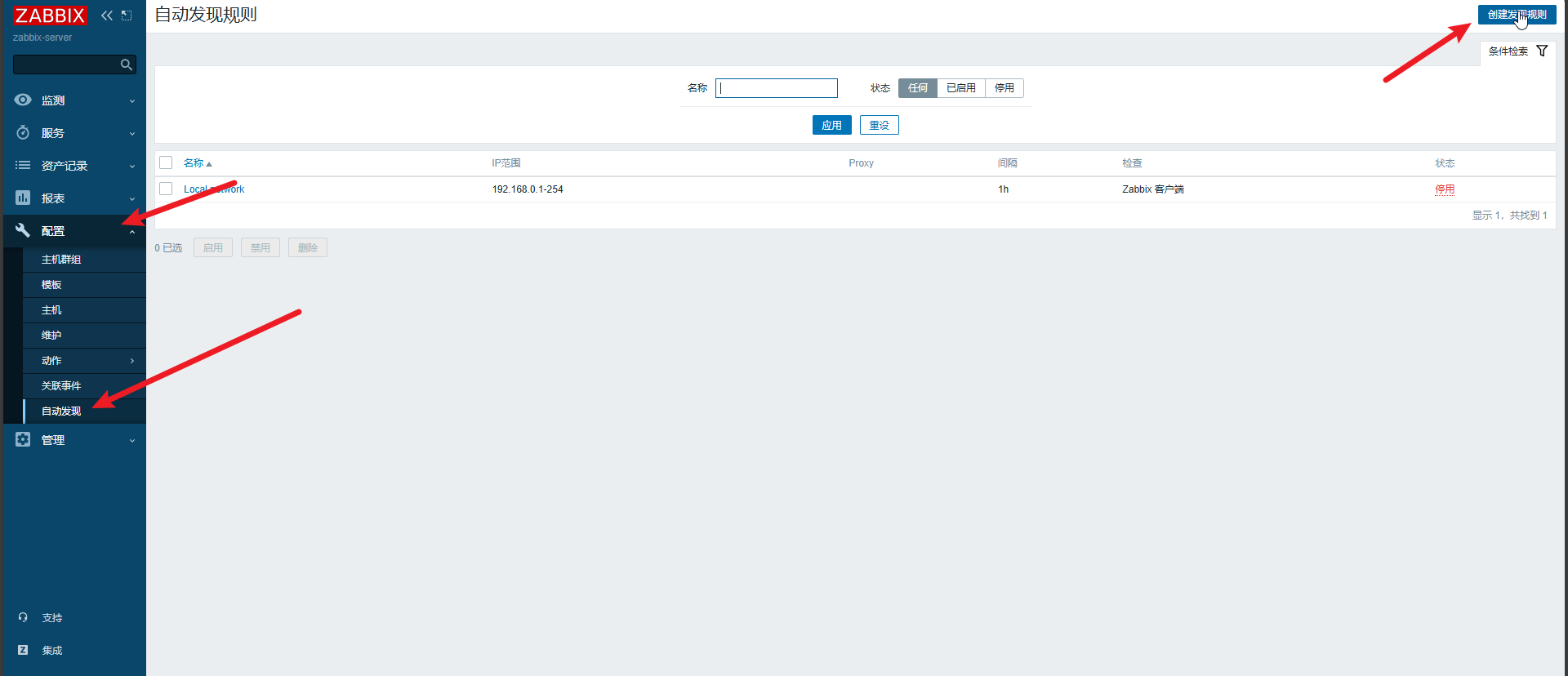 点击”配置“菜单下面的”自动发现“子菜单,点击右上角的”创建发现规则“按钮,如图: