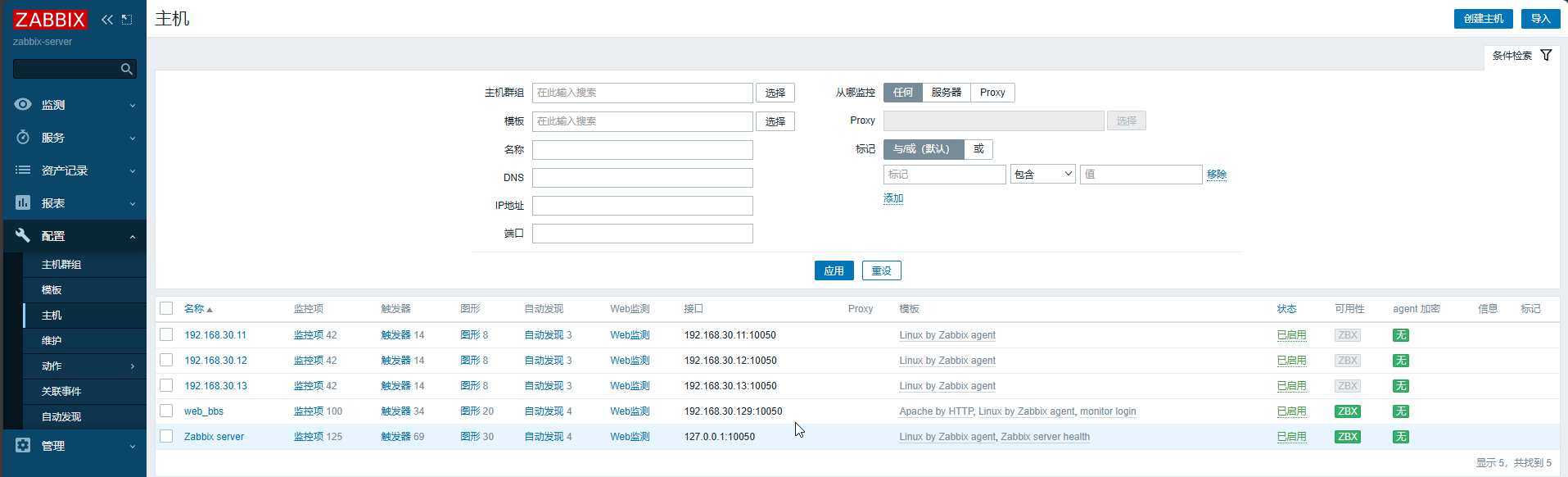 我们已经添加了Zabbix 监控服务器(192.168.30.13)和被监控 Web 服务器(192.168.30.129),此外,还有一台数据库服务器(192.168.30.11),在数据库服务器这台主机上我们安装部署了MySQL服务并监听了3306端口,下面我们就通过自动发现功能自动添加被监控主机,并绑定Linux by Zabbix agent监控模板