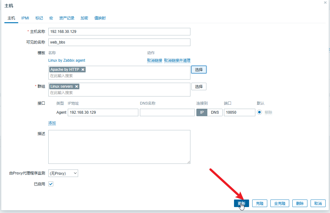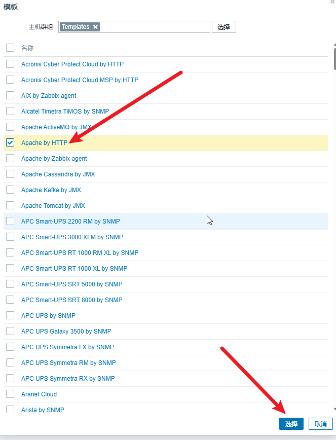 在弹出的 “模板” 对话框中勾选 “Apache by HTTP” 复选框,单击下方的 “选择” 按钮,如图 1 所示,在模板选择完成后单击 “更新” 按钮即可完成模板的绑定,如图 2所示。