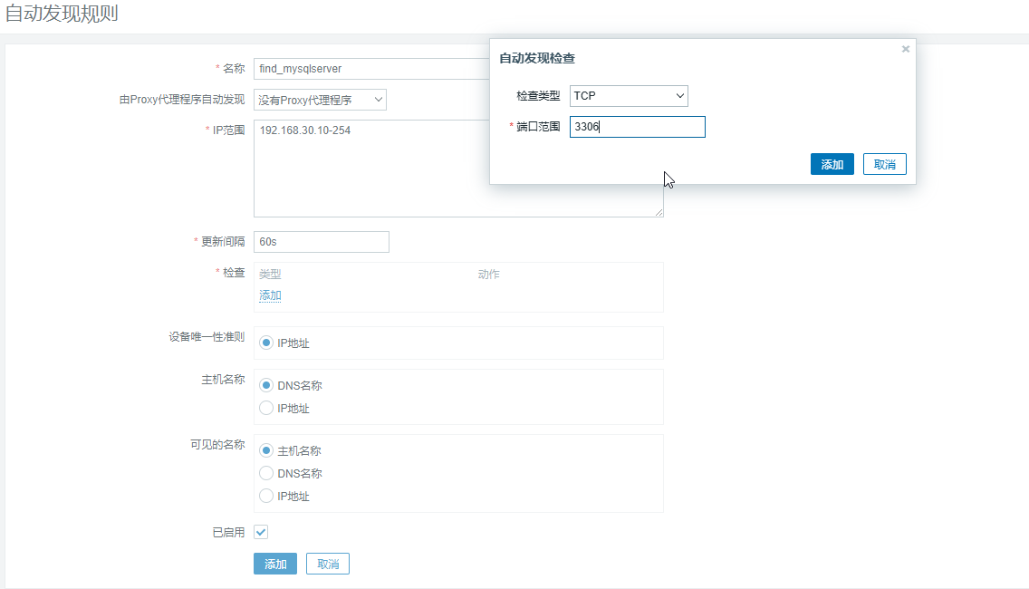 这里填写的 IP 地址范围为 192.168.30.10-254,需要发现的是自己的名称(可以任意),这里案例中的所有主机,在 192.168.30.10-254 之间的数据库主机 192.168.30.11,Zabbix 会扫描的 IP 地址范围是 192.168.30.10-254 之间的所有主机,在生产环境中时间间隔为 1h,在实验中为了快速看到实验效果,将重复间隔的设置为 60s,单击 “添加” 按钮,在弹出的对话框中设置扫描的检查条件,检查类型为 TCP,因为要监控数据库,所以端口范围为 3306单击 “添加” 按钮,设置完成后效果如图 所示。