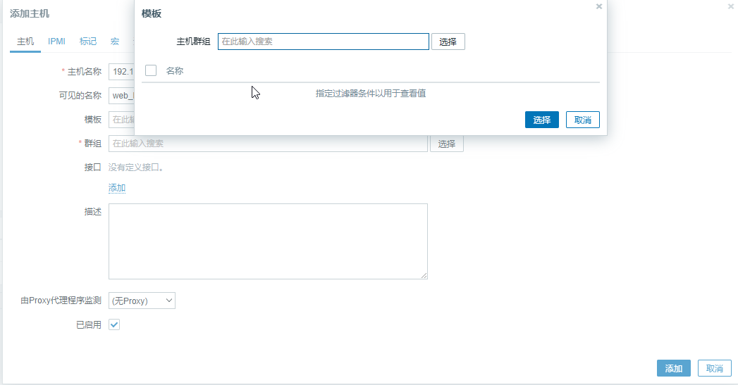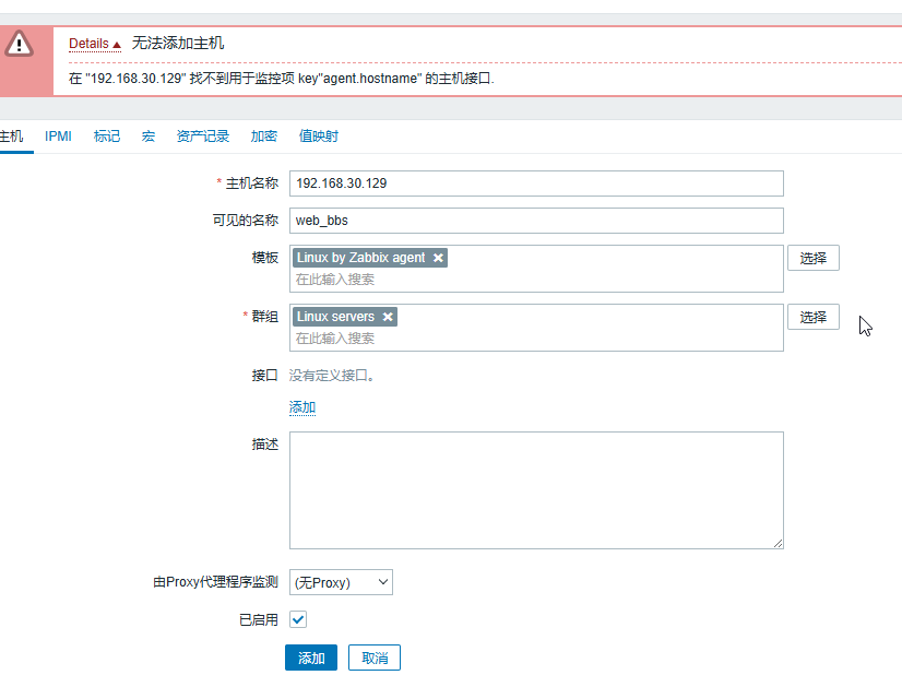 这里提示无法添加主机,我们需要添加接口,然后输入IP就可以添加了