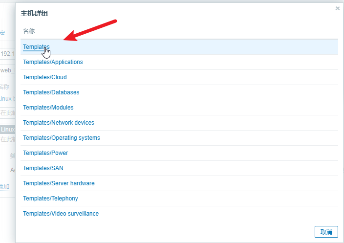 如果不想再绑定该模板,则可以单击 “取消链接并清理” 按钮。如果想要添加更多模板该如何操作呢?首先需要单击模板下面的 “选择” 按钮,如图1 所示,然后在弹出的 “模板” 对话框中单击 “主机群组” 对应的 “选择” 按钮,单击 “Templates” 模板,如图 2所示。