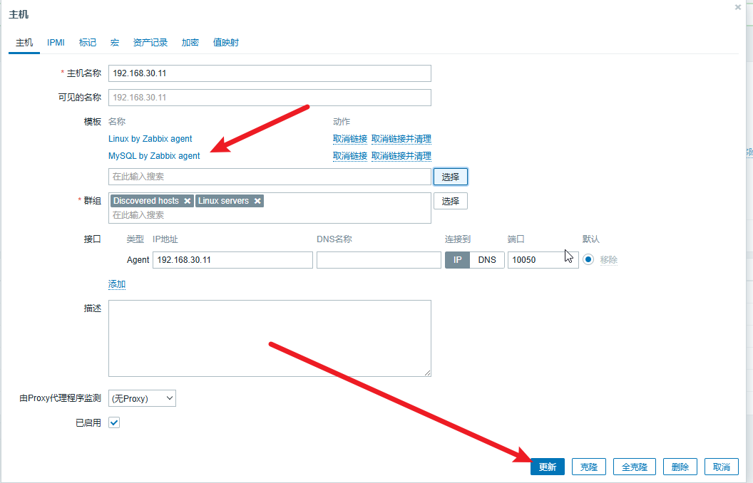 在被监控主机(192.168.30.11)完成以上操作后,我们还需要回到 Zabbix 监控 Web 页面,给被监控主机(192.168.30.11)绑定新的 MySQL by Zabbix agent 监控模板。