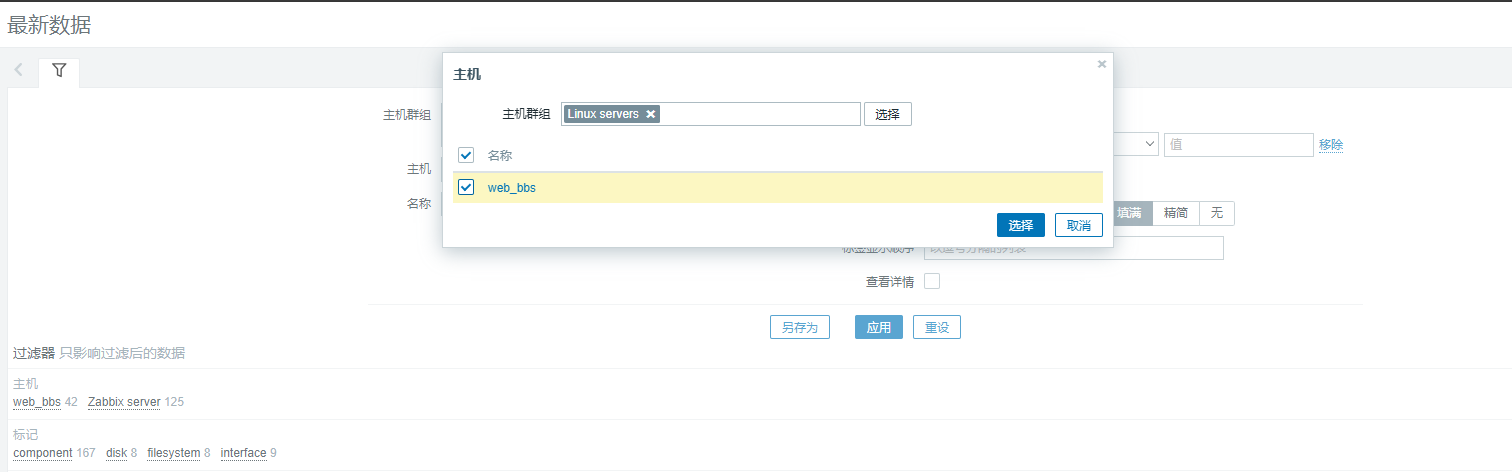 监控主机已经添加完成,并且绑定了 Linux by Zabbix agent 监控模板,这个 Zabbix 内嵌的监控模板可以让我们监控 Web 主机的几十项数据,如何查看这些数据呢?单击 “监测” 菜单下面的 “最新数据” 子菜单,在右边的页面中单击 “主机群组” 对应的 “选择” 按钮,勾选 “Linux servers” 复选框,单击下方的 “选择” 按钮,如图 所示。