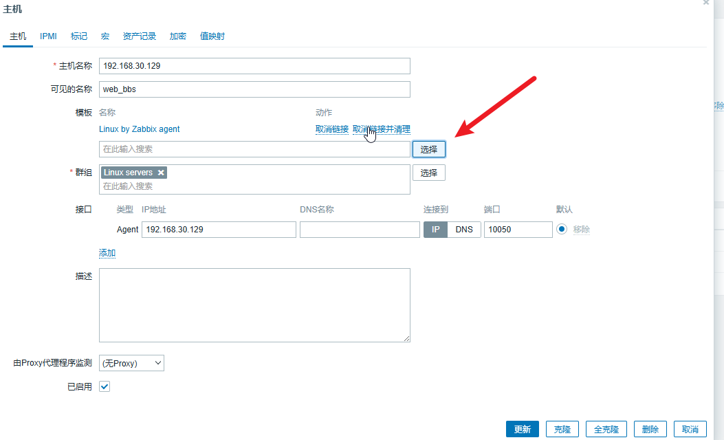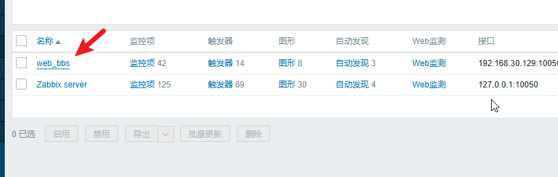 在我们的服务器环境中,Web 主机(192.168.30.129)就是一台 LAMP 主机,并且该 LAMP 主机上面还运行着一个论坛网址。如果我们想要监控 Apache httpd 服务,就需要给 Web 主机绑定相关的监控模板。单击 “配置” 菜单下面的 “主机” 子菜单,在右边的页面中找到需要绑定模板的主机(web_bbs),如图 1所示,勾选 “web_bbs” 复选框即可。