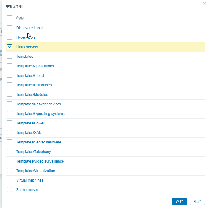 在生产环境中我们通常需要监控很多主机,如果每台被监控主机都是一个独立的个体,那么管理起来会很不方便,因此 Zabbix 提供了主机组的功能。我们可以把很多台被监控主机放到相同的监控组中,这样后期管理会更加方便。Zabbix 默认内嵌了很多组,如果管理员感觉不合适,也可以自己创建任意名称的主机组,这里我们将被监控主机加入内嵌的 Linux Servers 组。