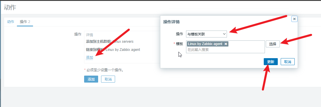 再次单击 “添加” 按钮,将 “Operation” 设置为 “与模板关联”,将模板设置为 “Linux by Zabbix agent”,如图1 所示。