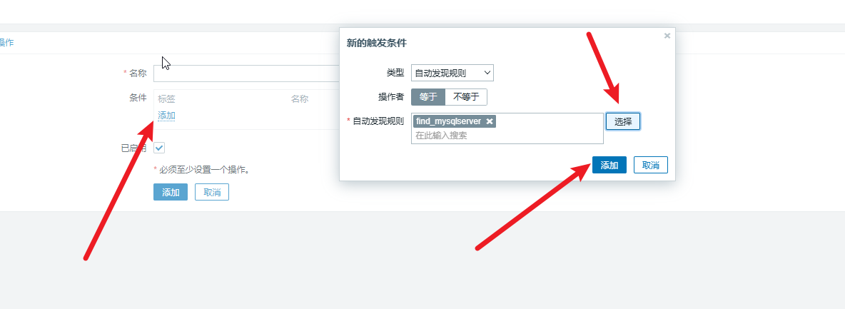 在创建自动发现规则后,还需要创建自动发现的动作。单击 “配置” 菜单下面的 “动作” 菜单,单击上角的 “创建动作” 按钮,如图 1 所示。在弹出的对话框中填写动作名称(名称可以任意),单击 “条件” 下面的 “添加” 按钮,在弹出的 “新的触发条件” 对话框中设置 “类型” 为 “自动发现规则”,“操作者” 为 “等于”,自动发现规则为 “find_mysqlserver”,单击 “添加” 按钮,如图 2所示。