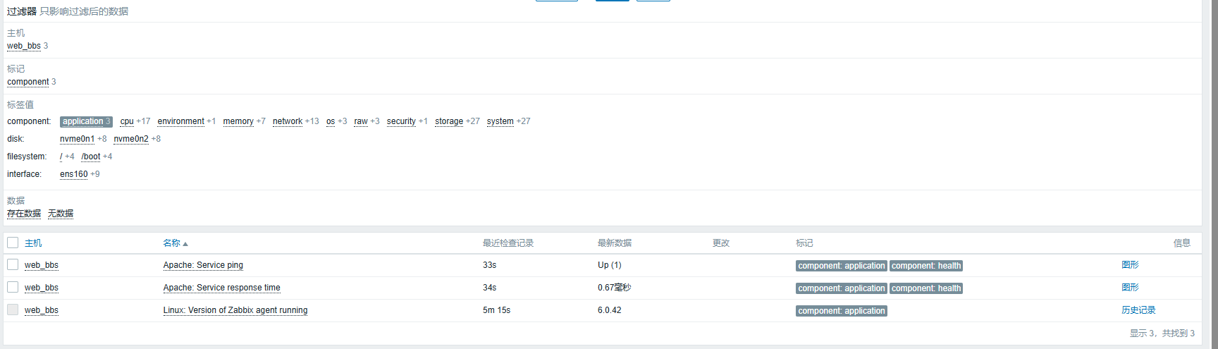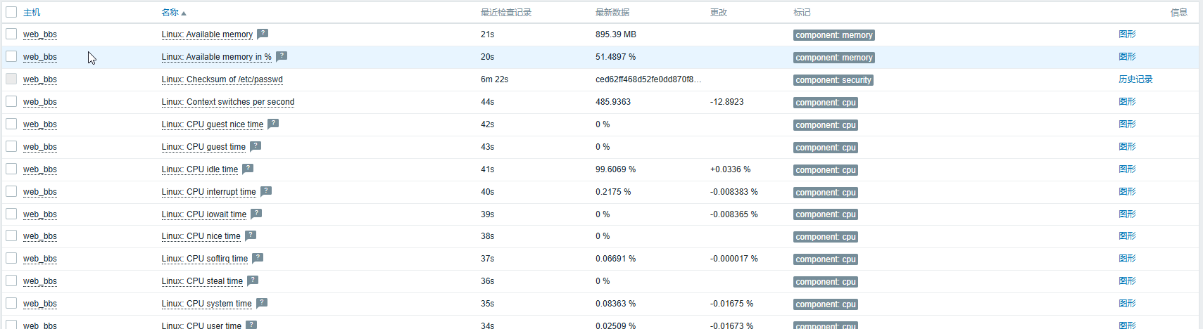 在绑定新的模板后,等待片刻后,就可以在“监测”菜单下面的“最新数据”子菜单里面找到对应主机的最新监控数据了