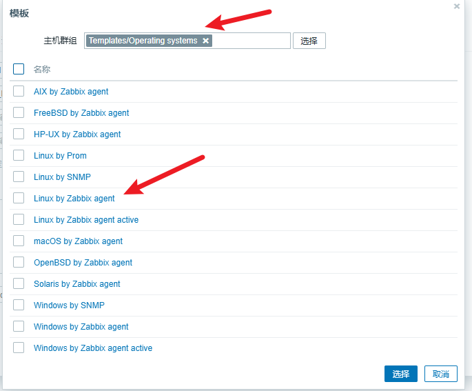 在添加被监控主机后,监控服务器 zabbix-server 进程会连接被监控主机 zabbix-agent 的 10050 端口,获取监控数据。但是,一台主机可被监控的数据太多了,到底要监控哪些数据。Zabbix 通过监控模板定义了具体需要监控哪些数据,Zabbix 软件在安装时默认就提供了很多内嵌的模板,我们可以单击 “模块” 后面的 “选择” 按钮,根据分类找到适合自己的模板,因为这台 Web 主机是一台 Linux 主机,所以我们选择 “Templates/Operating Systems” 这个模板分类,在右侧勾选 “Linux by Zabbix agent” 选项,单击 “选择” 按钮