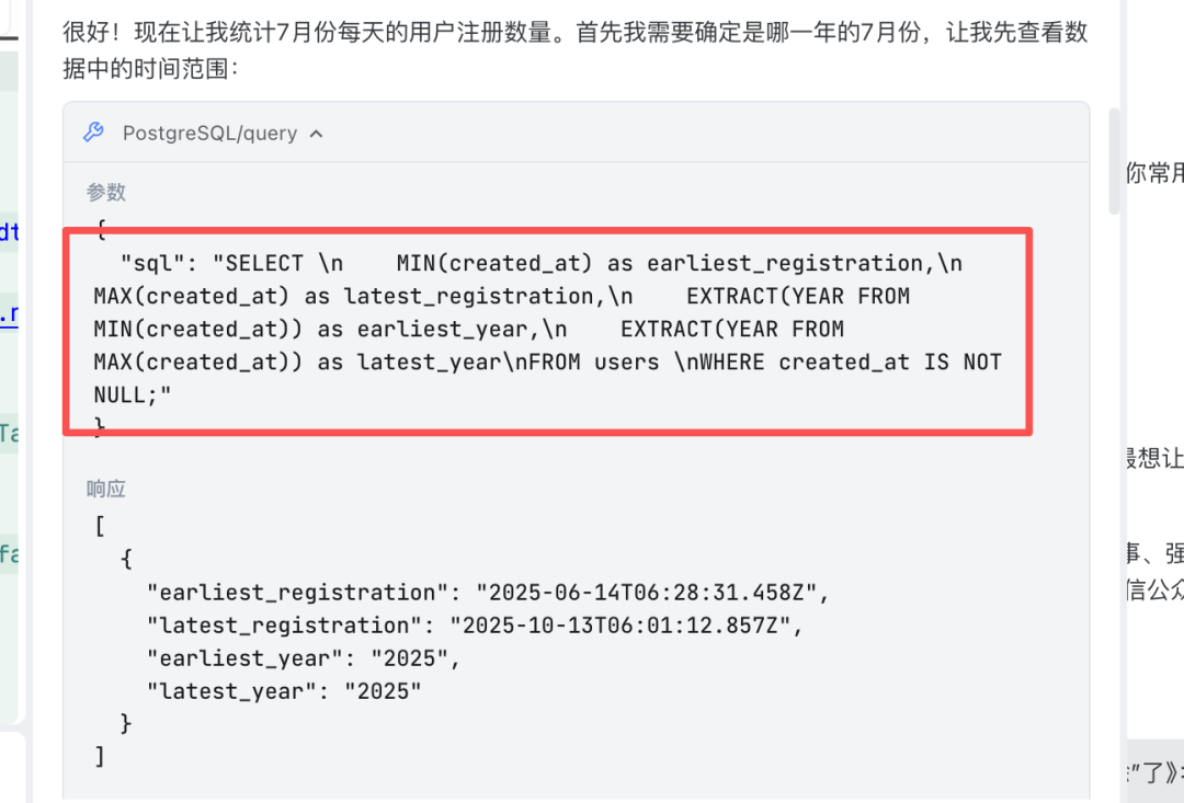 展开MCP的详情,就能看到AI写的SQL语句。比很多人写的严谨规范。