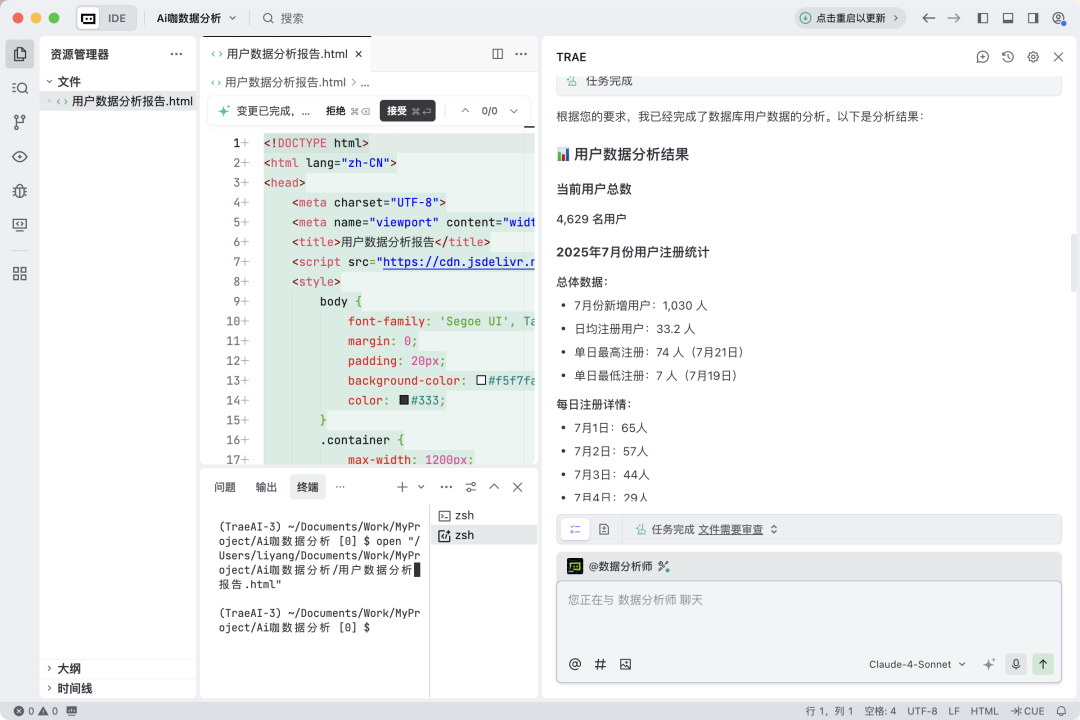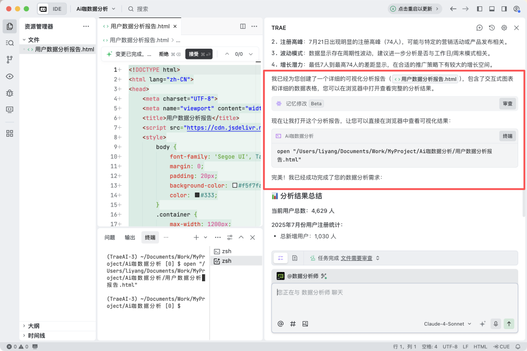 接下来我们再上一点难度,我需要做一份用户运营分析报告,直接告诉它。