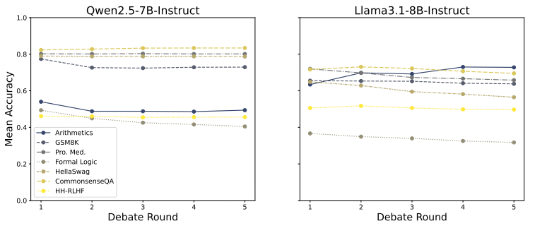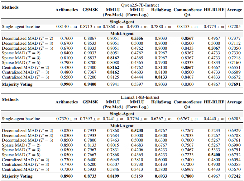 表 1 对比了 “单智能体”“多智能体辩论” 与 “多数投票” 在 7 个基准测试集上的性能(采用 Qwen2.5-7B-Instruct [22] 与 Llama3.1-8B-Instruct [23] 模型)。参考现有研究的常见设定,我们对比了 2 轮、3 轮辩论,以及延长至 5 轮辩论的场景(均使用 5 个智能体)。